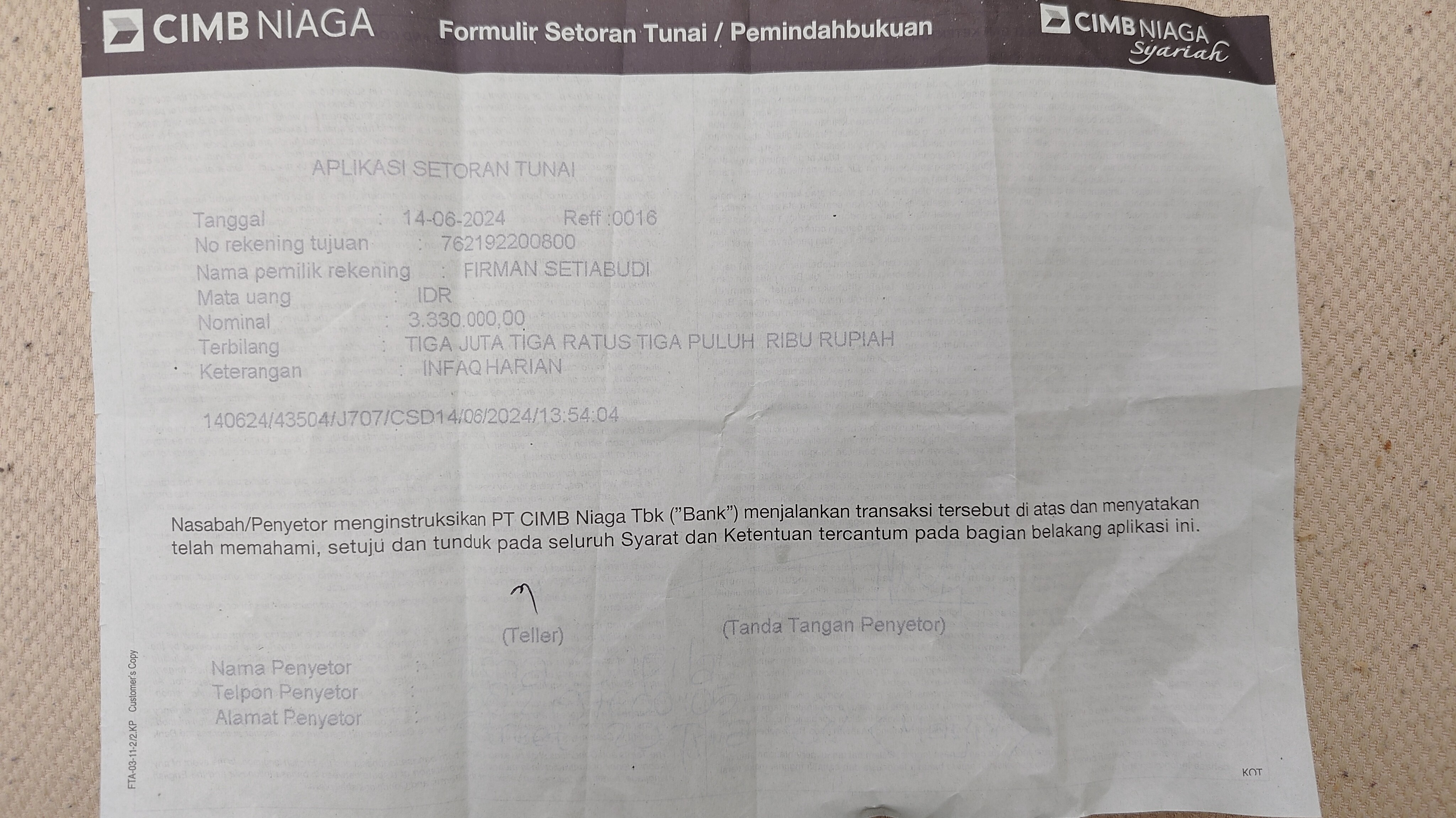 Nama/Tanggal Setor Bank: Tisna Gupita (14 Jun 2024)