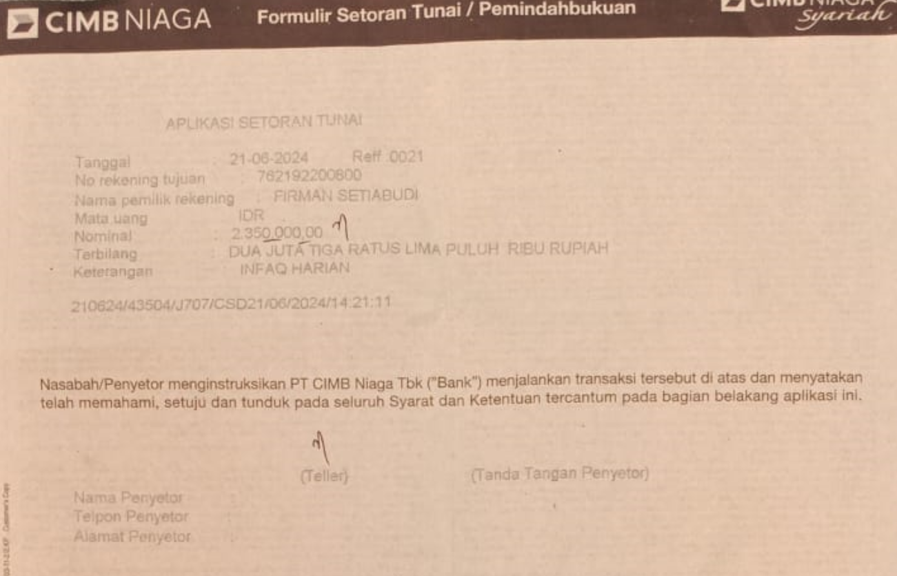 Nama/Tanggal Setor Bank: Tisna Gupita (21 Jun 2024)